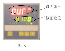 7.1.3 (見圖六)再按“SET”鍵若干次,找到所需要調整的控制參數(shù)的“SC”提示符,按功能鍵,使該控制參數(shù)顯示為所需要的值;SC = 原始SC值 +(實際溫度 - PV顯示值)