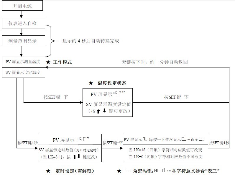 4.4 定時啟動后,不允許自整定。若需觀察運行的時間,按 鍵一下,SV 屏顯示剩余時間值。(注:定時總時間的確定,應考慮升溫,恒溫二階段合并計算);